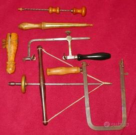 lotto di 6 Attrezzi (non vendo separatamente) costituito da: - Morsetto vintage in legno duro - trapanino a spirale - Piccolo Trapano a Volano - Calibro a Cono per Anelli (con marchio gioielleria Lunati), scala ad 2 a 32 praticamente come nuovo - Seghetto Vintage con arco largo - Seghetto made in Germany, inusato e come nuovo. è preferito il ritiro in Pavia per prenderne visione, senza impegno. eventuale spedizione Itaiia, 10 euro. vendita da privato. oggetto usato - si intende venduto con la formula "visto e piaciuto" non sono previste garanzia, sostituzione o restituzione
