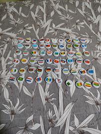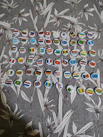 lotto di 60 tappi a corona di succhi di frutta indicanti le nazioni. Tappi anni 80, per amanti di collezionismo.