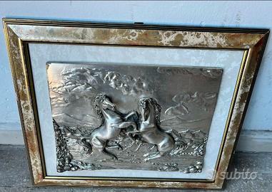 - Quadro Vintage con Opera di Cavalli in Rilievo su Lastra d'Argento e cornice in legno. Condizioni Buone. Misura quadro larghezza: 45cm, altezza: 37,5cm. Misura opera lastra argento larghezza: 32cm,altezza:24cm.
