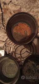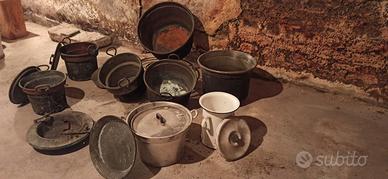Sei calderoni originali antichi dei primi anni 900, in rame di diverse dimensioni sia in altezza e anche come grandezza, due di questi hanno il coperchio, materiale solido integro e pesante.