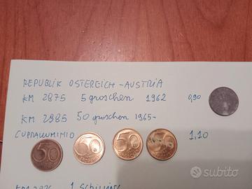 Lotto di monete austriache. - KM 2875: 5 Groschen, 1962 - KM 2885: 50 Groschen, 1965 - KM 2886: 1 Schilling, 1973/1986/1988/1993 - KM 933: 5 Centesimi, 1966-2004/1984/1988