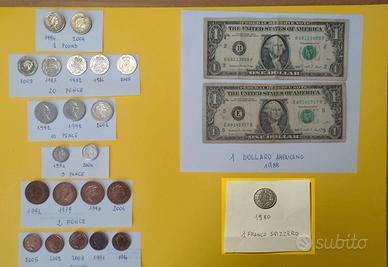 Lotto di monete GBP USD e CHF di annate molto interessanti per collezionisti ed appassionati Sono monete valide in circolazione e sono usate come da foto : 2 Banconote Dollaro Americano del 1988 2 Monete da 1 Pound del 1994 e 2004 6 Monete a 20 Pence del 1982 - 1983 - 1984 - 2005 - 2008 3 Monete da 10 Pence del 1992 - 2001 2 Monete da 5 Pence del 1991 - 2001 4 Monete da 2 Pence del 1979 - 1991 - 1998 - 2006 5 Monete da 1 Penny del 1991 - 1994 - 2002 - 2005 - 2008 1 Moneta da 1 Franco Svizzero del 1980 Prezzo valido per l'intero Lotto
