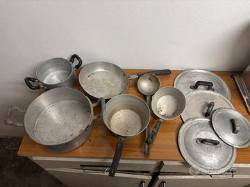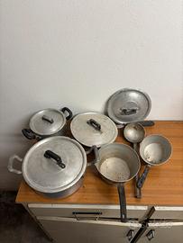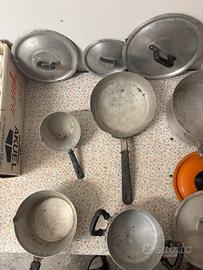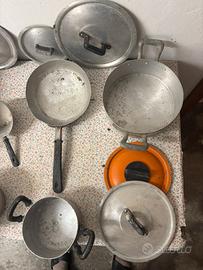 Vendo lotto di pentole e padelle vintage in alluminio, composto da vari pezzi di diverse dimensioni, completi di coperchi originali.