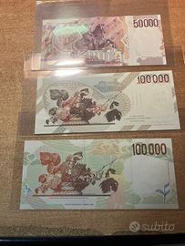 Repubblica Italiana, ottimo lotto di tre banconote fior di stampa come da foto, una lire 50000 2° tipo, una lire 100000 primo e secondo tipo