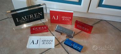 Lotto vari espositori da banco Guess Armani jeans Ralph Lauren - targhetta espositiva in metallo con il logo del marchio italiano Piquadro Un paio presentano qualche difetto