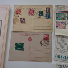 Lotto filatelico album 100 francobolli buste viaggiate cartoline vintage Lotto di materiale filatelico e storia postale composto da: ✉️ 3 buste viaggiate anni ’50–’60 📮 2 cartoline postali anni ’40 📚 1 album filatelico con circa 100 francobolli vari (anche collezione d’arte) 8 pagine di francobolli d'arte della collezione di Epoca Collezione mista di filatelia e storia postale, come da foto. Condizioni vintage con segni del tempo. Vendita esclusivamente in blocco. Spedizione con imballaggio accurato o ritiro a mano a Varese/Milano.