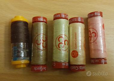 66 spole vintage assortite di filo per cucito di diverse tonalità e tipologie di filato (cotone e poliestere), diversi rocchetti sono di marche storici come Tre Cerchi Rosso (Filofort puro cotone), Coats Cucirini, Filofort e Radix, 5 sono ancora sigillati e 4 sono di filo elastico. I rocchetti vintage sono ottimi per chi cerca la qualità del cotone di una volta.