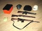 Bellissimo lotto dell'action figure GI JOE, presente il personaggio, vari accessori: 3 fucili, la cassa di sopravvivenza, borraccia, cappello da ufficiale tedesco, casco MP, berretto lana. Ci sono vari vestiti marchiati Action Man o Action Joe, sono usati e hanno qualche segno del tempo comunque discreti, presenti la giacca da agente, uniforme blu legione straniera, generale tedesco, mimetica da marine, divisa rossa canadese e divisa militare. Presente anche il lampeggiatore codice morse, esteriormente è discreto, dentro ha il contenitore delle batterie completamente arrugginito. I' action figure è il modello eagle eye, muove dunque gli occhi tramite la levetta sul retro che funziona perfettamente, ha gli arti superiori rotti nelle giunture e qualche piccolo difetto evidenziato nelle foto.