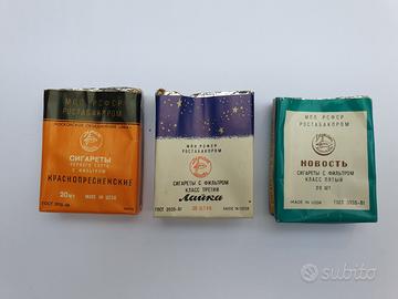 Lotto H composto di 3 rari pacchetti VUOTI di sigarette morbidi Vintage da collezione. Sono pacchetti da 20 sigarette in formato standard, senza filtro, tutti esteri di provenienza Ex UNIONE SOVIETICA. In ottime condizioni come da foto. Oggetti facenti parte di collezione privata anni 70/80. Oggetti preziosi per collezionisti.