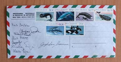 lotto ITALIANTARTIDE composto da adesivo ufficiale, busta con francobolli serie cetacei della Nuova Zelanda non viaggiata con annullo ufficiale e firme dei partecipanti alla missione scientifica, due minerali provenienti dall'Antartide.