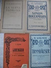 Vendo lotto di 12 libretti d'opera originali risalenti agli anni 1927-1933 editi da Ricordi e comprendenti opere di Verdi, Puccini, Pergolesi, Wagner, Mozart, Gluck quali Don Carlo, Tosca, Simon Boccanegra, La serva padrona, L'oro del Reno, Tannhauser, Lohengrin, Orfeo ed Euridice, Don Giovanni, Tristano e Isotta, Il crepuscolo degli dei, La Walkiria. Brossura, formato 13.5x20 e 12x19. Firma di appartenenza sulle copertine e alcune note a matita riportanti i nomi degli artisti.