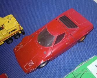 La Stratos rossa Burago è intera e completa. La Stratos Alitalia ha parti mancanti ed è buona per restauro o ricambi. La macchina rossa in scala 1:43 è Corgi ma è stata ridipinta. Il carro gru è Matchbox ed è integro e completo.