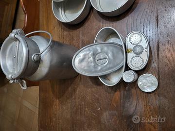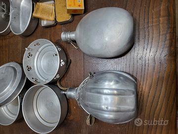 Vendo splendido e raro lotto di equipaggiamento militare originale della Seconda Guerra Mondiale (WWII), appartenuto a ufficiale/sottufficiale del Regio Esercito. Tutti i pezzi sono in alluminio di alta qualità, in eccellenti condizioni di conservazione, completi di marchi di fabbrica nitidi. Il set è composto da pezzi storici delle migliori ditte dell'epoca: Fornellino Scaldarancio META-42: Modello svizzero originale (Basilea) del 1942, pezzo tecnico d'élite, completo e pulito. Contenitore Termico ROFAN: Grande bidoncino cilindrico marchiato A. Marchesi - Torino, con chiusura a scatto e manico originali. Gavette e Borracce: Vari modelli tra cui una borraccia Guglielminotti (nervata) e una Mod. 30, marchiate Guerci, Rossi & C. (Milano) "Alluminio 99%". Accessori rari da rancio: Portasale/pepe con decorazione a conchiglia sbalzata e burriera interna. Set Sanitario e Manutenzione: * Scatola originale Boli Militari (Mentolo ed Eucaliptolo) dell'Istituto Chimico Farmaceutico Militare. Rara confezione di Sapone Medicinale all'Acido Salicilico (Alleanza Cooperativa Torinese) praticamente intonsa. Foglietto istruzioni originale Tergiflex B-102 per la pulizia delle armi. Condizioni: Gli oggetti non presentano fori o ossidazioni pesanti. La patina è originale dell'epoca, mai lucidati con prodotti abrasivi per preservarne il valore storico. Ottimo per collezionisti di militaria italiana, rievocatori storici o per esposizione in vetrina. Prezzo: € 320 (Trattabili per acquisto rapido) Spedizione: Disponibile con imballaggio accurato o consegna a mano in zona [Torino].
