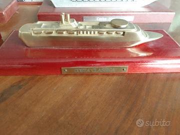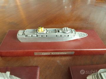 Lotto di cinque modellini in ottone o bronzo con base in legno delle navi Costa Crociere con i seguenti nomi: Costa Concordia (90 euro), Costa Magica (80 euro) e Costa Romantica (70 euro) con finitura argentata, maggiore definizione dei dettagli e colorazione giallo e nero dei fumaioli; Costa Classica e Costa Romantica in color ottone lucido e minore definizione dei dettagli a 50 euro cadauna. Vendibili singolarmente ai prezzi indicati oppure in lotto a 300 euro.