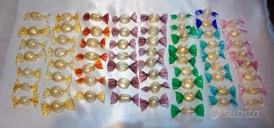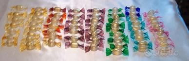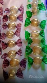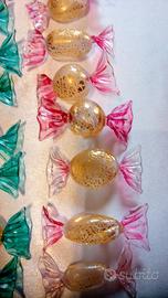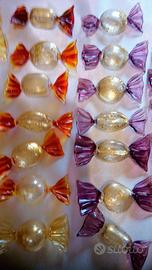 Lotto di n.63 caramelle di Murano originali create a lume con colori, e forme differenti in vera foglia d'oro. Ottime per regalini agli invitati (come segna posto) in occasioni speciali.. (cene aziendali) o come bomboniere per battesimi, comunioni, lauree. Per un'idea super elegante, originale, ed unica nel suo genere potrebbe essere un piccolo albero di Natale inserendo le caramelle al posto delle consuete decorazioni. Le misure sono varie per i prezzi se preso l'intero lotto ci sarà un prezzo più vantaggioso! Altrimenti la selezione mista (forme, e colori) va di minimo pz.N.6 a € 78 + sp.( cad.€ 13) PER L'INTERO LOTTO N. 63 pezzi TOT. € 630+ SP. (cad.€10) PREZZO NON TRATTABILE.