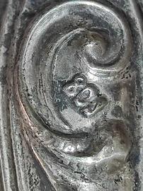 Lotto oggetti argento/argentati: - penna biro Germany punzone 925; - n. 2 coltelli e 2 forchettone (2 posate hanno marchio 800-vedi foto): - apri bottiglie, ha il manico con marchio 800.
