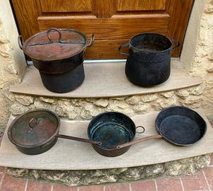 LOTTO 5) La seconda pentola, a parere mio, è molto fascinosa e più antica delle altre, presenta delle riparazioni d'epoca che la rendono una piccola opera d'arte dei vecchi maestri del tempo mentre un manico della pentola grande si muove, sono saltati i due punti di giuntura