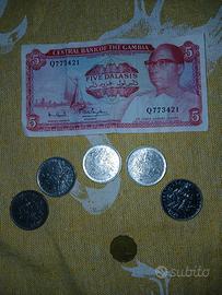 banconota del Gambia , monete da 5 franchi francesi (1970,1971,1978)e una moneta di Honk Kong 1975