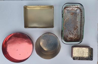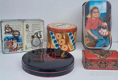 Vendo lotto completo di scatole in latta vintage originali, ideali per arredamento casa in stile retrò, shabby o country.