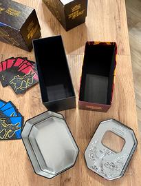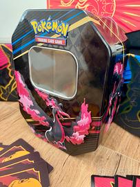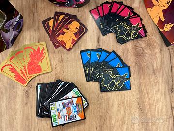 Vendo lotto di scatole porta carte pokemon , due tin grandi di metallo serie zenit regale, 5 scatole set allenatore . Vari divisori del porta carte . 70 codici da riscattare.
