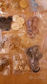 Bottoni Gourmet e particolari, molte bustine già suddivise per set e un barattolo di plastica (con segni di etichette staccate) pieno di bottoni misti sfusi di ogni forma e colore.