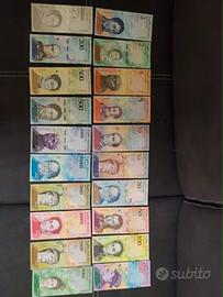 Splendido lotto di banconote originali del Venezuela, testimoni di uno dei periodi economici più incredibili della storia moderna. La collezione include diverse emissioni (Bolívar Fuerte e Soberano), caratterizzate da una grafica straordinaria che celebra gli eroi nazionali e la biodiversità esotica del Sud America (giaguari, tartarughe marine, aquile arpie).
