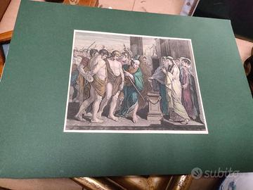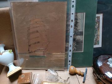 Lotto composto da un timbro(recante la scritta "procuratore capo" periodo del Fascio,coppia di bicchierini da rosolio incisi a mano periodo fine 800, piccolo vasetto a cratere in porcellana con fiori in rilievo in policromia (recante il marchio "Capodimonte) difetti, periodo prima metà del XIX sec, scatolina porta fiammiferi Art Deco, piccolo vassoio in porcellana manifattura tedesca periodo Liberty, cornicetta in noce della seconda metà del 700 e con incisione anch'essa del 700(capilettera), portagioie in vetro Cloud Glass George Davidson color seppia con pomello in argento a forma di frutto(pera) periodo Art Deco, olio su rame (anni 1970) in cornice antica, porta tabacco in alabastro periodo del fascismo, stampa acquerellata a mano rappresentante Oreste e Pilade al cospetto di Ifigenia, stampa acquerellata a mano scena bucolica,firmata in basso a destra "Salimbeni", acquerello raffigurante veliero firmato in basso a destra.