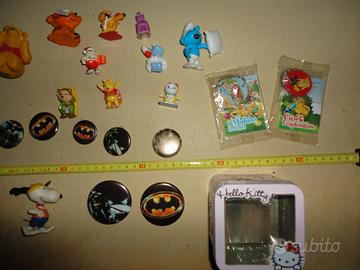 Vendo anche oggetti a scelta ma il prezzo varia e con minimo di acquisto Lotto composta da vari oggetti + FIGURINE PANINI FIORUCCI 1984 , in ottime condizioni .n. 55, 32, 132, 161, 30, 160, 25, + 5 adesivi fuori raccolta 1984 + 22 pezzi tra personaggi e gadget vintage vari Condizioni ottime. Lotto composta da 7 spille Batman : 2 di diametro 5,5 cm e 5 da 3,5 cm 2 portachiavi mulino bianco sigillate 1 mascotte Italia 90° sigillata ( testa e solo sfilata da pupazzetto non rotta) 1 scatola metallo hello kitty – 9 x 9 x 7,5 cm 11 personaggi vari •Antico apribottiglie vintage, 24 cm anni 70. Apribottiglie vintage grande in rame, apribottiglie grande unico, accessorio bar gigante. Misure 24 x 10 Spessore 2 / 3 mm •"KOH-I-NOOR" Taglia capelli / Taglia barba manuale a molla . Come nuovo, mai usato, acquistato solo per collezione, funzionante. Scatola in condizioni come da foto. •Tenaglia / tronchese anticha, manca molla di richiamo. Ma funzionante nei movimenti. Lunghezza 16 cm da chiusa. In caso di spedizione aggiungere 10 euro.