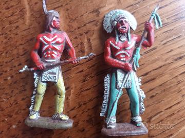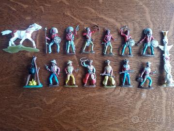 LOTTO VINTAGE ANNI '50 COMPOSTO DA 6 INDIANI E ALTRETTANTI COWBOYS + TOTEM, UN CAVALLO E FOCOLARE, IN TOTALE QUINDI 15 PEZZI. UN SET DAVVERO MOLTO INTERESSANTE: LE MINIATURE SONO COME DA DESCRIZIONE IN PLASTICA MORBIDA/CROMOPLASTO MA AL CONTEMPO PARTICOLARMENTE ROBUSTA.