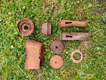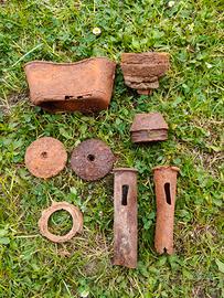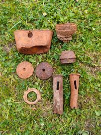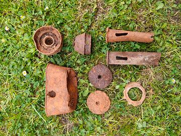 Vendo lotto WW1 1) Bicchierino italiano impattato da scheggia. 2) Spoletta di un 75mm 3) Spoletta di un 65mm 4) 2 diaframmi di un 75mm 5) 2 picchetti da tenda italiani 6) Ghiera di calibrazione del 75mm
