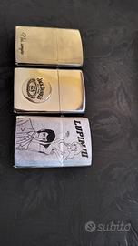 Zippo. - Primo accendino con incisione disegno di Lupin III nuovo - Secondo accendino con placca logo Jack Daniel's. Usato ricondizionato - Terzo accendino con incisione Noi, sempre.usato ricondizionato