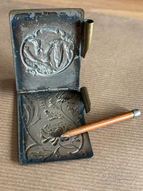 Porta blocco con matita “Lourdes”. Dim. circa 7x4,5 cm. Il materiale sembra ottone.