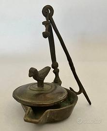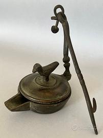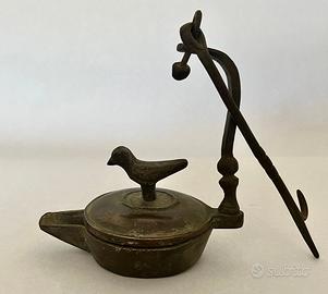 lucerna a olio in bronzo gr 500 cm 28x7,5 circa.Fine "800 . Uso primo era per miniera con coperchio che scorre e classico uccello sopra