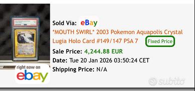 Carta Pokémon old Lugia Aquapolis gradata PSA 7. Carta mai pulita ne restaurata. È stata spedita a PSA direttamente nelle condizioni in cui si trovava. Ritiro a mano in Toscana. Ultimo venduto 4.300€ il 20 gennaio 2026.