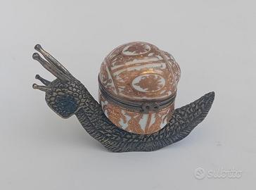 Lumaca "The Royal family" in ceramica e metallo, fastoso disegno in doratura su fondo bianco, l'apertura centrale del guscio consente di accedere ad un contenitore di piccoli oggett. Dimensioni: lunghezza cm. 12, altezza cm. 6,5. Ceramica integra senza lesioni e sbeccature.