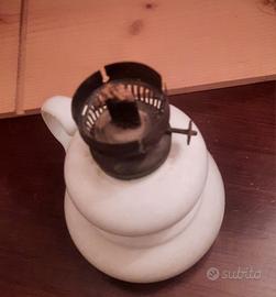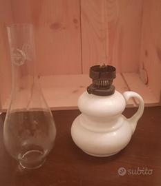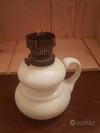 Lampada a petrolio in vetro opalino bianco inizi 900 con stoppino e rotelliera e paralume in vetro. Pezzo da collezione. Misure: altezza base cm.13, diametro cm.9. Altezza boccia vetro cm.20. Altezza totale cm.33