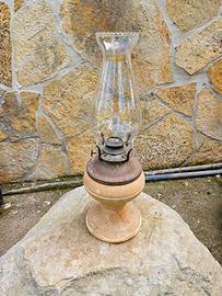 Lume a petrolio integro, funzionante, senza marca. Conserva i colori originali. La base è in pietra leccese.