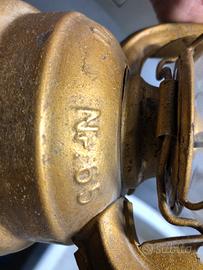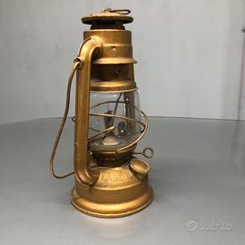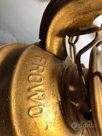 Antico lume a petrolio completamente restaurato e dipinto a mano color oro.ancora efficiente utilizzabile con olio combustibile o simili.lume del periodo della seconda guerra mondiale.FROWO N.65 Made in Germany,l’ampolla di vetro è anch’essa originale come si vede nel dettaglio delle foto.solo per intenditori o collezionisti
