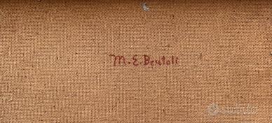 Natura morta di E. M. Bertoli eseguita a olio su masonite, con vaso di fiori, mele, bicchiere e bottiglia di vino disposti su un tavolo chiaro. La composizione è equilibrata, con pennellate corpose e compatte che modellano bene i volumi e la luce. I toni caldi degli oggetti in primo piano si staccano dallo sfondo più freddo e sfumato, creando un’atmosfera tranquilla e raccolta, tipica della pittura figurativa italiana del secondo Novecento. Dimensioni: 66x50