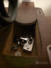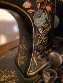 Volendo è ancora funzionante. ha i rocchetti originali e accessori nel cassettino a lato della macchina. Le decorazioni sono ancora ben visibili.