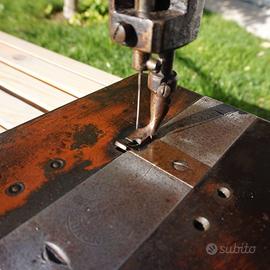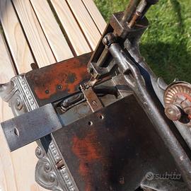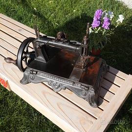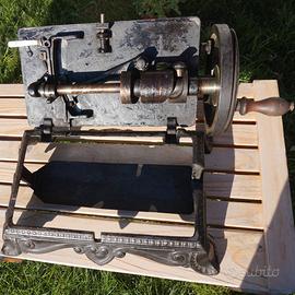 Antica macchina da cucire a mano, a manovella, di fine ‘800 – Bremer & Bruckmann – Original Brunonia - Germania. E’ funzionante, oliata e completa di navetta e di meccanismo per avvolgerla. La costruzione è in ghisa e acciaio ed il peso è di 9 Kg. Le dimensioni di base sono di circa cm 35 x 23 – altezza cm 25