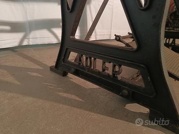 Struttura in ghisa, trasmissione a pedale con volano, piano in legno massiccio.