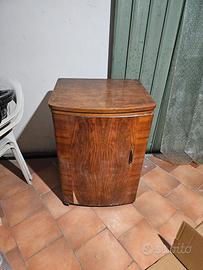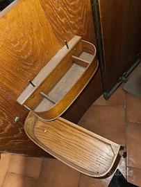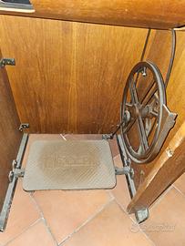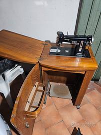 La macchina è montata nel suo mobiletto originale in legno con apertura a scomparsa e sistema a pedale manuale.