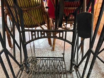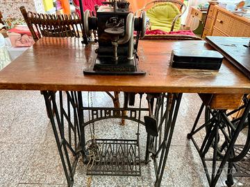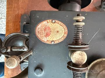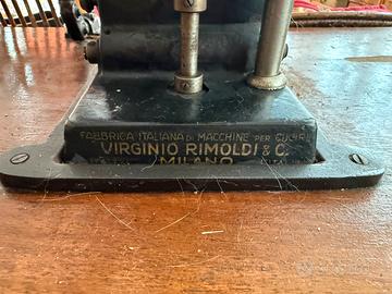 Rara macchina da cucire industriale Virginio Rimoldi di Pavia, anni ’30-’50, perfetta per pelle e cuoio. Modello originale con testa in ghisa nera dipinta, volano, pedale e meccanismo a manovella visibile nella foto. Struttura robusta con ingranaggi in metallo, ago diritto e piastrina per lavori pesanti. Dettagli Tecnici •Marca e Modello: Virginio Rimoldi & C., Pavia (targa originale). •Tipo: Industriale post-bellica per pellami, guanti, borse o calzature. •Condizioni: Buone, patina d’epoca, ingranaggi fluidi (testata ma non revisionata). •Accessori Inclusi: Completa di tavolo/bancale in legno massiccio, gambe metalliche regolabili, cassettiera frontale per fili/utensili, motore originale Si presenta su piano stabile, dimensioni compatte (circa 60x30 cm testa, tavolo 120x60 cm), peso importante per uso professionale. Ideale per hobbisti, artigiani o collezionisti.