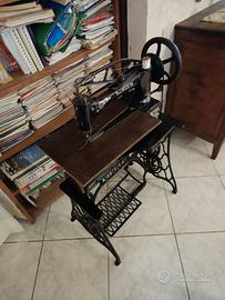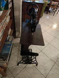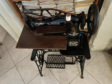 Macchina da cucire per calzolai, completa del suo cassetto/banco in legno originale Singer (vedere foto macchina appena prodotta, da manuale), piantane in fusione di ghisa recanti il marchio Singer.
