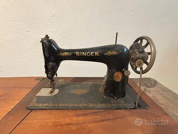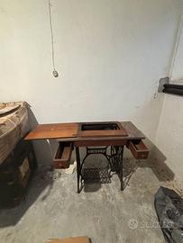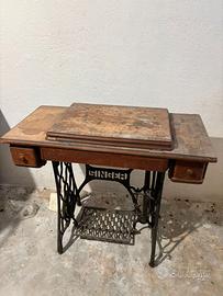 Macchina da cucire di inizi '900 marca Singer nera con decorazioni dorate, a pedale montata sul suo mobiletto originale. Struttura in ghisa con pedale per l'azionamento manuale e piano di lavoro in legno con cassetti laterali. La parte superficiale del mobile è segnata dal tempo, ma solida, è da restaurare. Da ritirare in loco.