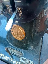 Macchina da cucire Singer vintage, prodotta nel 1934 e identificata dal numero di serie MA590231. Nera con rifiniture dorate e conserva il fascino autentico dell’epoca. La macchina è completa di pedale per un utilizzo comodo e preciso. Richiudibile con sistema a scomparsa