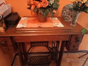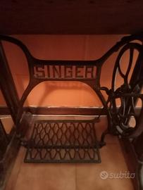 macchina da cucire primi del 900, base in ghisa con logo Singer, legno parzialmente trattato dai tarli. Completa di cinta in cuoio di trasmissione. Numerata