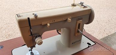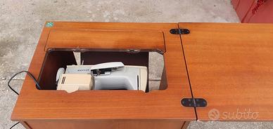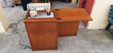 La macchina è un modello vintage (anni '70/'80), ideale sia per appassionati di cucito che per chi cerca un pezzo d'arredamento vintage funzionale. Una volta chiusa, la macchina scompare nel mobiletto che diventa un pratico piano d'appoggio o scrivania.