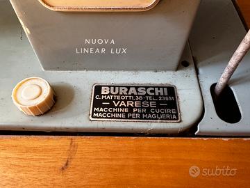 Macchina da cucire vintage Buraschi Hannover Linear Lux prodotta a Varese, con mobile di legno annesso. Presenta manopole manuali per la regolazione della tensione del filo e la lunghezza del punto. Il corpo macchina è in metallo.